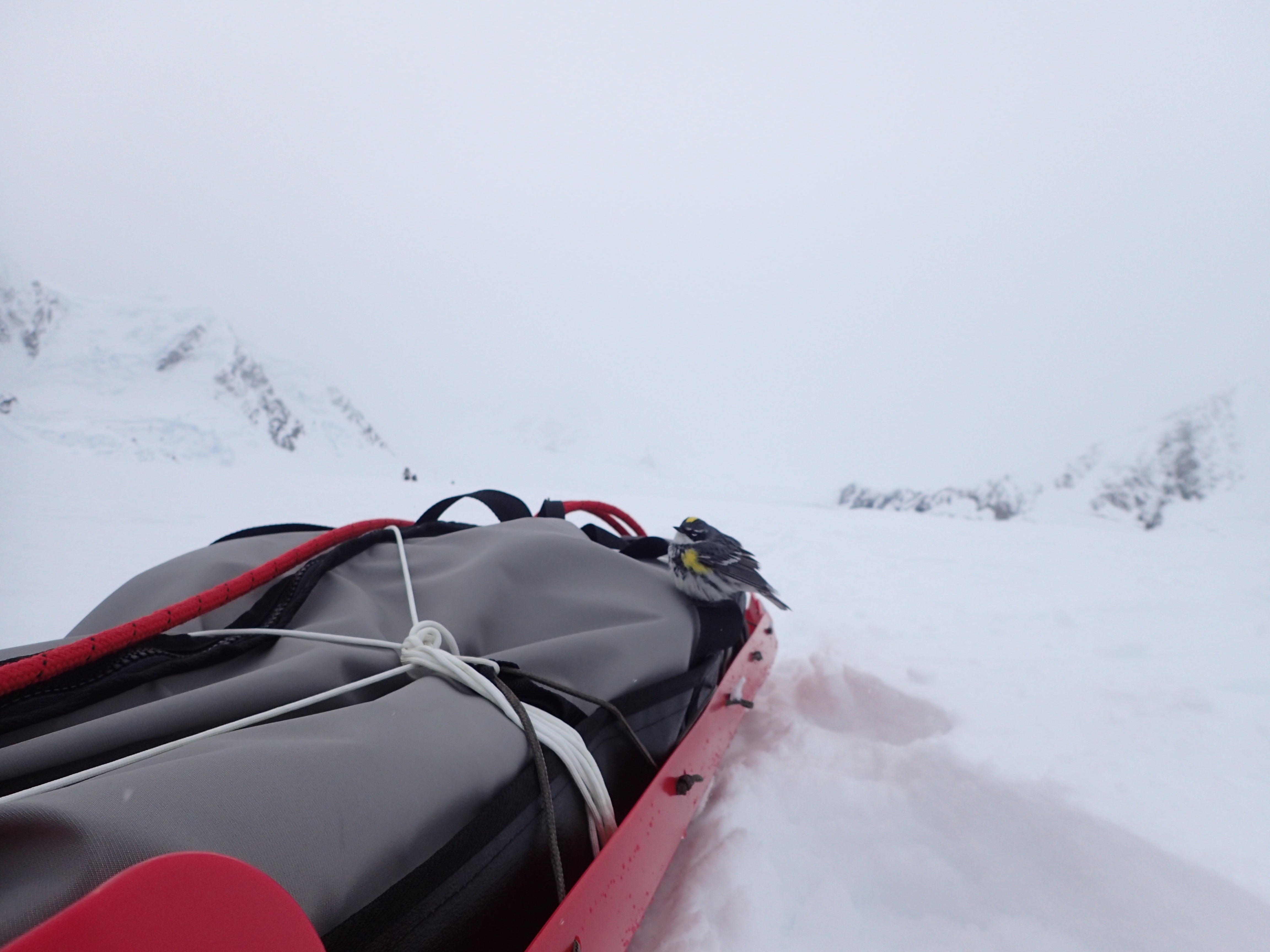 First 650 meters ascent to cache is ok, we are making good progress, but the snowstorm is soon upon us. We pick up ice saws (to cut snow blocks at hire camps where we will need to build snow walls to protect from the artic winds) a few shovels and we are off for the second part of the day. During one of the short breaks (pix below), a small bird lands on my sled, it is very cute but does not belong here, it must have been lost in colds winds and end up on the glacier at high altitude. As most of its kind, it will die in the next 1 or 2 days from extreme cold and exhaustion. It couldn’t find its way out of Denali, Talkeetna is much too far for him to garner the energy to fly out.